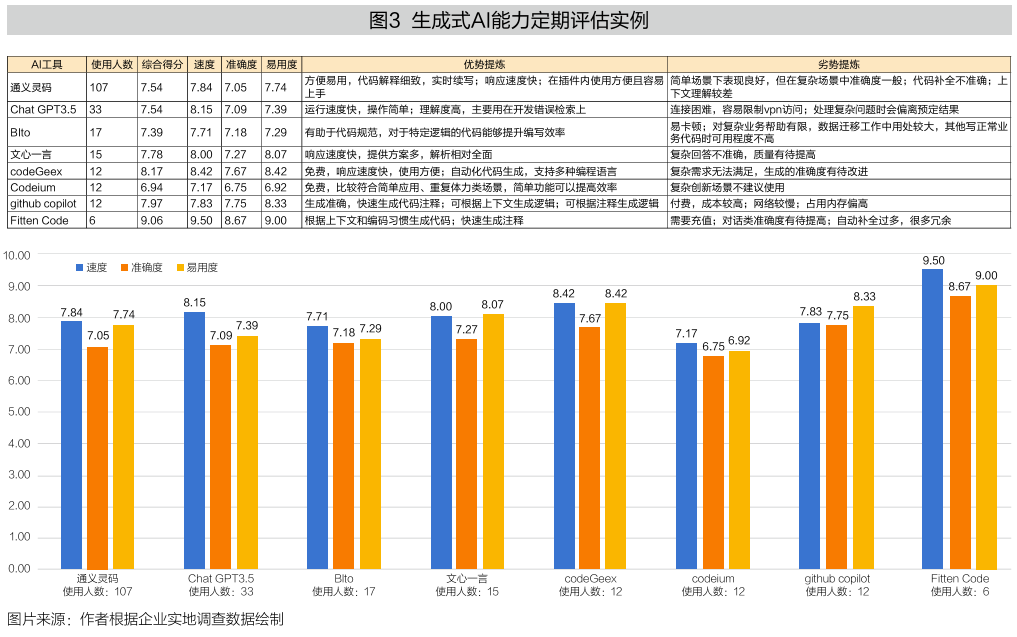其次,理解生成式AI的优势和局限性是开展有效的人机合作的基础。通过持续学习与实践,员工可以熟悉生成式AI工具的强项和弱点,了解生成式AI在哪些场景中表现最佳以及何时需要人类的判断力。例如,生成式AI有时会生成看似不合常规的创意或“错误”,但这些意外可能包含着新的机会。员工可以通过“逆向合作”,将AI生成的意外作为新的起点,利用这些非传统的创意进行再开发,挖掘潜在的创新方向。员工使用生成式AI的系统培训应包括对AI工具的实操演练、案例分析以及对生成式AI生成内容的应用策略。企业还应通过数据驱动的反馈机制,定期收集生成式AI交互的数据和员工的使用反馈,分析交互的有效性,及时调整和优化AI的使用策略,推动合作效果的持续提升。图3展示了某大模型公司内部研发团队对生成式AI辅助代码开发的定期评估,涵盖了对不同生成式AI在速度、准确性和易用性方面的评分,以及对其优势和劣势的分析,为进一步提升员工与生成式AI的协作质量提供了重要参考。