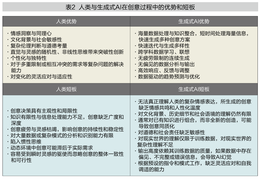 表2详细列举了人类与生成式AI的优势和短板。企业在实施人机合作策略时,应认真考察这些因素,以推进AI和人类在各自的优势领域协同工作,努力实现生产力的最优模式。