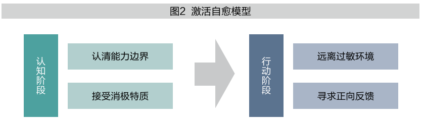 下面,就让我们站在职场人的角度,试着探讨如何更好地调动和激发起自愈能力。具体而言,这一过程分两步走:认知阶段和行动阶段。认知阶段是指个体需要对负面情景或者压力情景有一个总的观点,这种观点使个体把这种负面归因于个体之外。以此从认知维度减轻对自身的关注,从而避免压力感过分集中于自身。行动阶段是指个体通过与外界交互的行为,减小负面情景或者压力情景对自身的影响,并且通过和外界的交互补充个体在负面情景下损耗的个体资源,让个体保持更好的工作状态(见图2)。