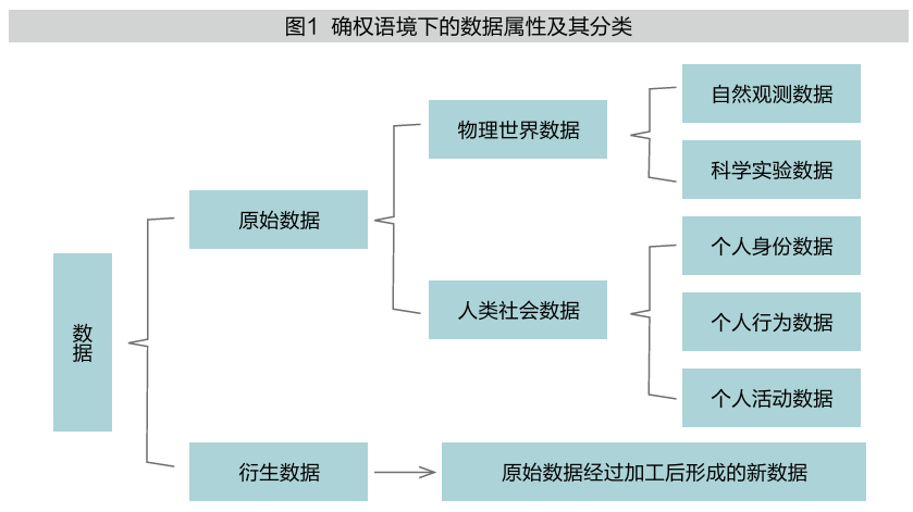 数据确权是对数据的所有权、使用权、收益权和占有权进行明确的分配和认定。这通常涉及到数据所有权的确定、数据访问和使用的规则制定、数据隐私和安全的保护等方面。由于数据从生产到交易涵盖创造、加工、使用、收益等一系列环节,加之数据的可复制性和共享性,使得数据确权问题变得日益复杂。根据是否经过二次加工以及数据加工和处理的主体,我们将数据分为原始数据和衍生数据(见图1)。