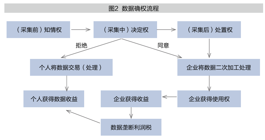 综上,从数据所有权确定,到数据主体将数据使用权让渡给企业或平台,平台获得数据的收益权,对于具有绝对市场份额和垄断优势的平台则对其垄断利润征税,再通过税收将收益返之于民,实现数据确权闭环(见图2)。