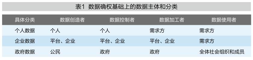 为了更精准地实施数据确权,除了明确对数据进行分类之外,还需要对各类型数据的双重属性进行有效的明确界定。据此,本文在原始数据和衍生数据分类基础上,通过进一步明确数据创造、数据控制、数据开发和数据使用的主体,可以将数据分为由个人创造的个人隐私数据、由企业加工后形成的企业数据和政府等相关部门采集的数据,具体分类见表1。