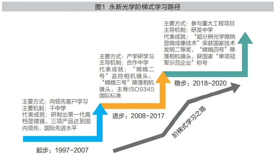 永新光学的发展史,是一条清晰的阶梯式技术学习路径。从早期向领先客户学习基本的生产工艺与产品设计知识,到与高校院所进行产学研合作学习新产品开发,再到参与国家重大工程进行研发学习来探索前沿技术。永新光学逐步实现了技术能力的飞跃,产品从功能单一的低端显微镜扩展到光学显微镜,自身也从加工光学元件的小企业成长为一家为嫦娥人造卫星制造多款光学镜头的冠军企业。