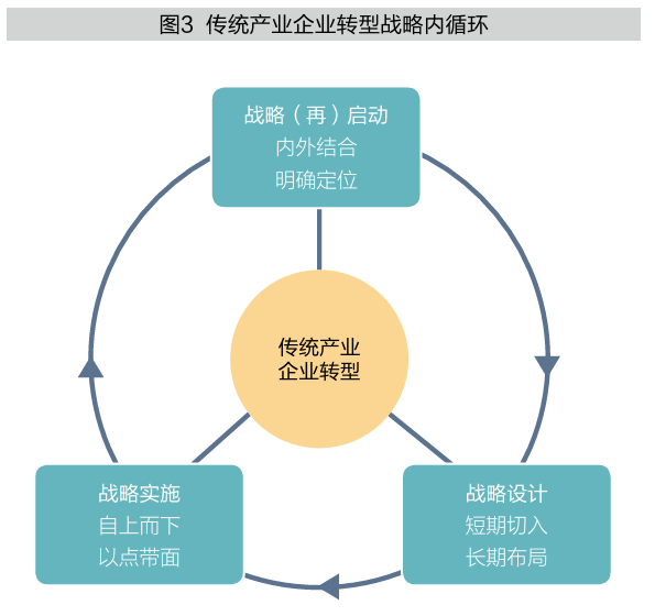 从过程视角来看,传统产业企业的数智化转型需要战略先行,依靠全局思维和系统方法分阶段逐步推进转型战略从启动到设计再到实施,最终形成内循环并不断迭代(见图3)。企业可以根据外部环境的变化和自身需求的调整持续推进转型,在依靠转型提升能级并实现跨越式发展的基础上,逐渐与产业链同游的其他企业达成转型战略的协同共演,并辐射至产业链上下游,最终带动全产业链的联动转型升级,实现转型战略企业内循环与产业外循环的同频共振。