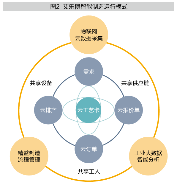 艾乐博抓住锅具生产环节的核心三要素人机物,确保数智化在思维、方法和工具三个层面同步推进。团队基于实践经验和对工业机器人生产全过程的深刻理解,将生产流程标准化、模块化、原子化。艾乐博的智能制造运行模式强调物联网云数据采集、精益制造流程管理、工业大数据智能分析的三位一体,基于其智能机加共享平台易图灵开展。该平台聚焦以数智化提升生产全流程的精细化与敏捷度,通过云计算技术建构需求云报价单云订单云工艺卡云排产智能交付的闭环(见图2)。