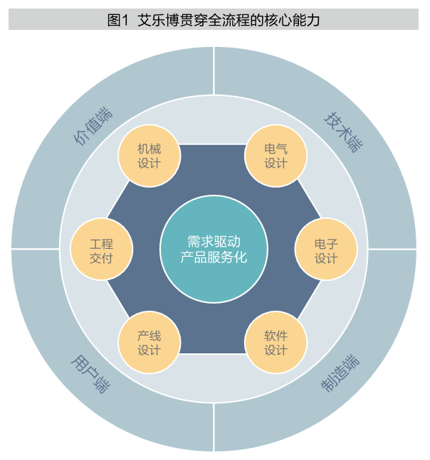 在自主创新体系设计上,艾乐博通过机械设计、电气设计、电子设计、软件设计、产线设计及工程交付六大技术体系,构建贯穿技术端、制造端、用户端、价值端的全流程创新能力(见图1)。当前,艾乐博精通设计的技术类人才占比超过60%,拥有一百多项专利技术,首发转移工件机器人双臂设计、全自动化复合加工中心等多项创新成果,自主研发了机器人操作系统(Robot Operating SystemROS)、仓库管理系统(Warehouse Management SystemWMS)和物料调度系统(Warehouse Control SystemWCS)。