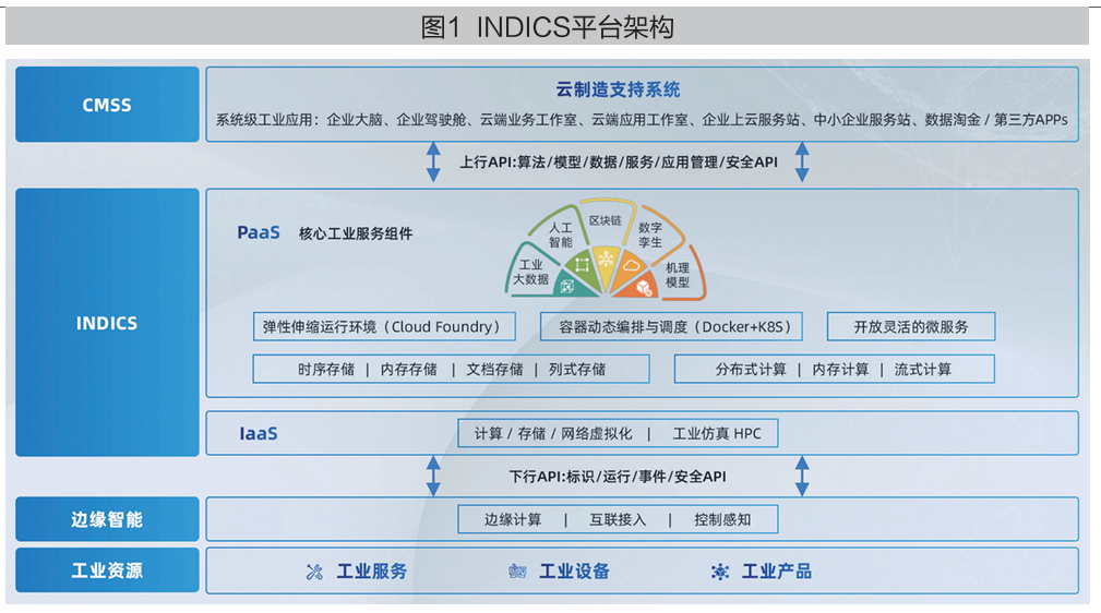 航天云网公司的一个基本思路是,先推进技术开发,把平台搭起来,把集团内部的服务做扎实,以此迭代技术并积累产业运营经验。基于此,航天云网把工作重点放在了对内实施“数字航天”战略上,航天云网App也定位于首先服务内部专网。此后两年,持续的技术开发迭代与运作,使航天云网的技术日臻成熟,公司择机在2017年面向全球发布了中国首个工业互联网平台INDICS。通过工业设备联网,INDICS平台进行信息和数据采集,汇聚海量的工业大数据,从而形成了以“平台总体架构、工业大数据、平台与产品服务、智能制造和网络信息安全”五大板块为核心的“1+4”发展体系。2018年,航天云网公司又发布了云制造支持系统(Cloud Manufacturing Support System,简称“CMSS”)等航天云网的核心架构,开发了更多的云服务产品,夯实了航天云网建立工业互联网体系和走向全球的基础(见图1)。