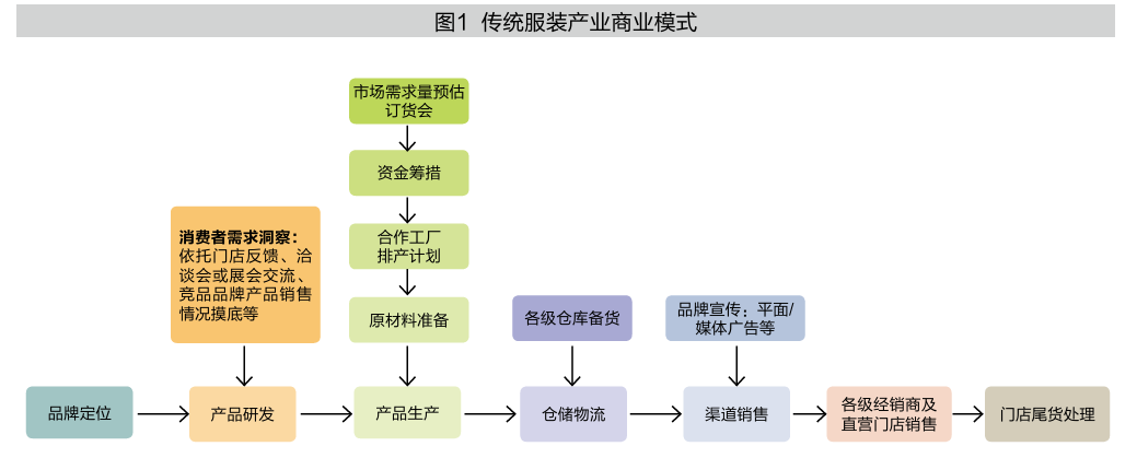 服装行业虽然经历了从按部就班的链条式协作,到工厂、品牌及销售各自发展、相互匹配,再到用品牌整合供应链的演进,但商业模式(见图1)并没有发生本质变化,始终存在诸多难以解决的顽疾。