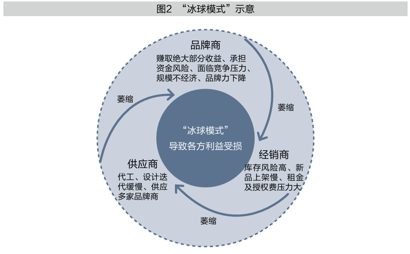 我们将利益相关者之间由于传统“进销存”模式问题导致非良性内部博弈,进而像滚动的 “冰球”一样越发松散,以致影响生态进步的模式称为“冰球模式”(见图2)。