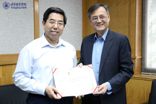 钱颖一院长为马建堂局长颁发兼职教授聘书