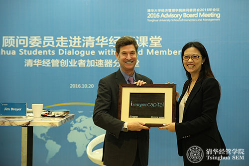 2016年10月20日,清华经管学院顾问委员会主席、Breyer Capital创始人兼首席执行官吉姆·布雷耶(Jim Breyer)先生走进清华经管创业者加速器,与清华学子以及创业者们探讨了有关投资与创业的话题。布雷耶是一位天使投资人,他旗下的Accel Partners拥有Facebook 11%的股权,其本人也持有Facebook 1%的股份;他还曾经先后担任过美国国家风险投资协会主席,以及美国风险资本家西部协会会长。