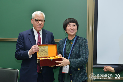 清华经管学院顾问委员、华盛顿布鲁金斯研究院理事会主席、巴里克黄金公司联席董事长约翰•桑顿(John L. Thornton)接受同学们赠送的礼物