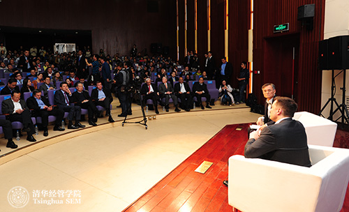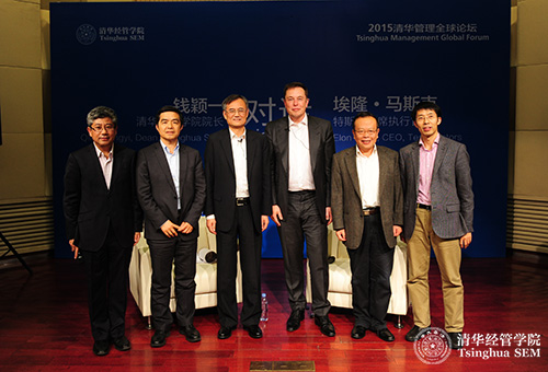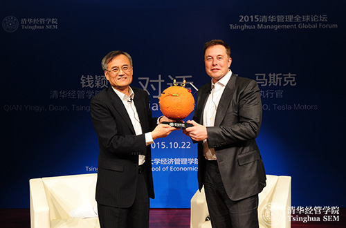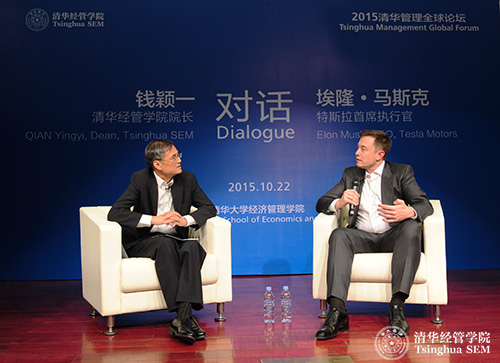 2015年10月22日晚,作为世俱杯官方网站顾问委员会2015年会议的系列活动之一,清华管理全球论坛在清华经管学院伟伦楼报告厅举行。清华经管学院顾问委员会委员、特斯拉(Tesla)联合创始人、首席执行官兼产品架构师,SpaceX首席执行官兼首席设计师,SolarCity董事长埃隆•马斯克(Elon Musk)与清华经管学院学院院长钱颖一教授展开两小时精彩对话。论坛还邀请到世俱杯官方网站物理系教授朱邦芬院士、汽车工程系欧阳明高教授、电机工程与应用电子技术系系主任曾嶸教授参与对话。清华管理全球论坛由清华经管学院副院长、弗里曼讲席教授白重恩主持。