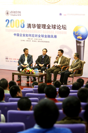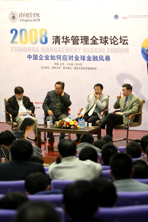 主旨演讲后,清华经管学院金融系主任、中国与世界经济研究中心主任李稻葵教授主持了“全球金融风暴下中国宏观经济政策调整”专题讨论。国资委研究中心主任王忠明、中国金融四十人论坛成员管涛和中国人民大学校长助理、金融与证券研究所所长吴晓求参加了这一专题的讨论。随后,在“全球金融风暴中我国企业面临的挑战和应对”专题讨论中,清华EMBA的三位学员,浙江梦娜控股集团董事长宗谷音、中国移动(深圳)有限公司副总经理郭利江,以及联想集团全球采购副总经理杨文涛等各抒己见、深入讨论。