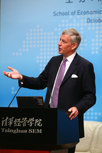 2010年10月20日,由清华经管学院主办的“2010清华管理全球论坛”在学院伟伦楼国际报告厅召开。本次论坛的主题为“创新时代的全球领导力”,500多位各界精英齐聚清华,共同探讨如何提升创新能力与全球领导能力,以应对迅速变换的国际经济环境。论坛开始前,清华经管学院院长钱颖一教授发表欢迎致辞,并邀请麦肯锡公司董事长兼全球总裁鲍达民(Dominic Barton)先生作主题发言。