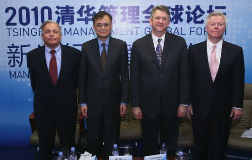 左起依次为:哈佛商学院前任院长杰·莱特教授、清华经管学院院长钱颖一教授