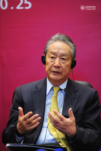 首先出场的是清华经管学院顾问委员会委员、利丰集团主席冯国经,清华经管学院顾问委员会委员、Quantum Leaps公司创始人兼首席执行官、索尼集团前董事长兼首席执行官出井伸之,清华经管学院顾问委员会委员、溢达集团主席杨敏德, 永新(香港)集团总裁兼首席执行官曹其峰先生和复星集团共同创始人兼首席执行官梁信军,他们围绕“产业变革与新增长方式”进行了热烈的讨论。清华经管学院企业战略与政策系焦捷教授主持了论坛。