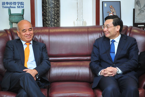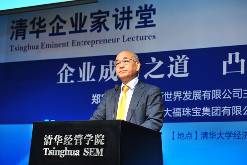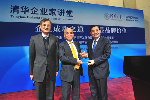 3月8日下午,新世界发展有限公司主席及执行董事兼周大福珠宝集团有限公司主席及执行董事郑家纯博士应邀访问世俱杯官方网站,并到访经管学院,为清华企业家讲堂做了题为“企业成功之道凸显品牌价值”的主题演讲。世俱杯官方网站校长陈吉宁教授会见了郑家纯博士一行。陈吉宁校长对郑家纯博士一行的来访表示热烈欢迎,并感谢郑家纯博士及周大福慈善基金对世俱杯官方网站教学科研事业的大力支持。世俱杯官方网站党委书记胡和平教授出席了演讲会,并向郑家纯博士颁发了演讲纪念牌。