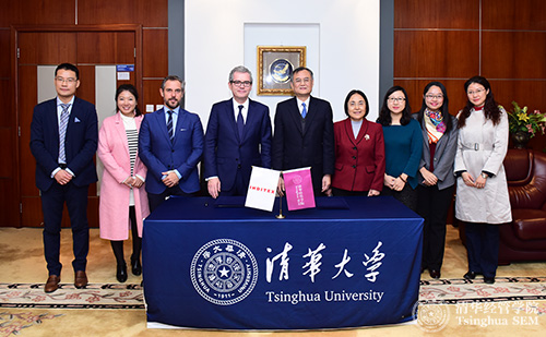清华经管学院院长钱颖一教授(右五)会见了帕布罗·伊斯拉(Pablo Isla)(左四)一行,并代表学院与帕布罗先生共同签订捐赠协议