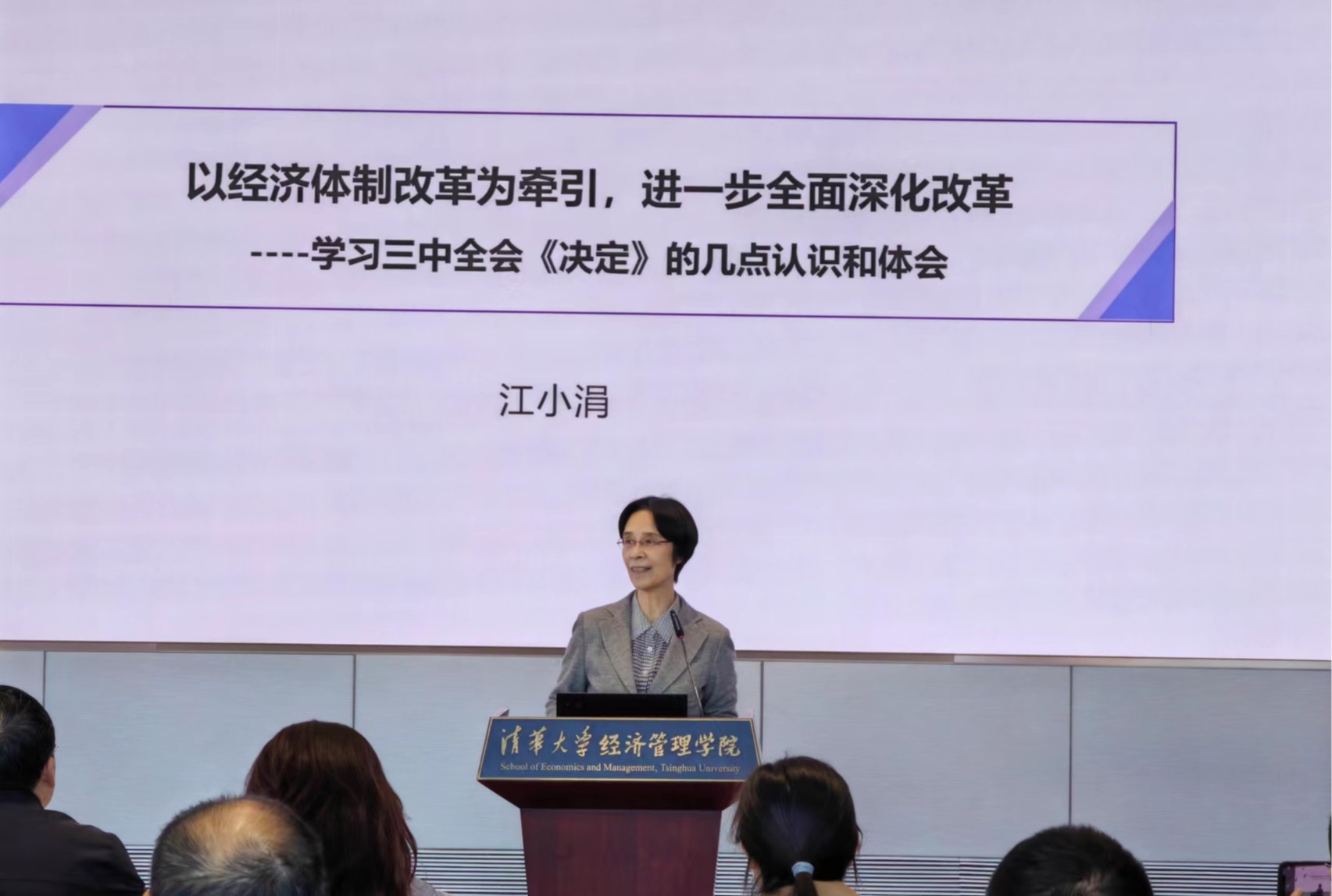 2024年7月15日至18日党中央召开的二十届三中全会审议通过了《中共中央关于进一步全面深化改革、推进中国式现代化的决定》(以下简称《决定》),深刻阐述了进一步全面深化改革、推进中国式现代化的重大意义和总体要求。为深入学习贯彻全会精神,10月8日下午,清华经管学院在建华楼组织全院理论学习,邀请著名经济学家江小涓教授作题为“以经济体制改革为牵引,进一步全面深化改革”的报告,包括学院理论学习中心组成员在内的约150位教师职员参加。