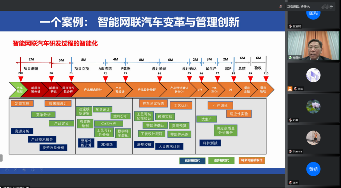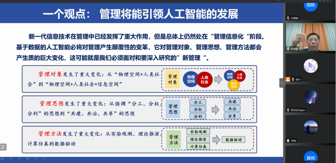 首先,杨善林院士作了题为 “管理将能引领人工智能的发展”的线上报告。杨院士从一个案例“智能网联汽车变革与管理创新”出发,生动地讲解了随着信息技术的发展,智能网联汽车在研发、制造、行驶与运维过程中哪些工作已经被人工智能取代,哪些工作正在逐步被取代,以及哪些工作在未来有可能被取代。杨院士指出,在现有人工智能技术支持下,凡是规则性较强的驾驶活动和制造活动都有可能被人工智能取代,汽车人工智能的发展正是管理者利用市场机制推动的。