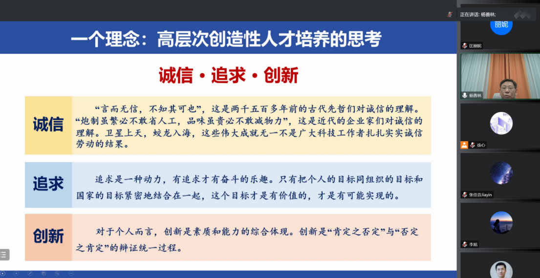 在报告的最后,杨院士分享了他对高层次创造性人才培养的一些思考。他提出要培养 “诚信、追求、创新”的人才去解决以上问题,以及关于研究生所需具备能力的领导力、创造力和洞察力的“三力模型”。