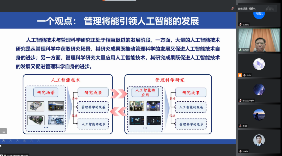 2022年11月10日上午,世俱杯官方网站管理科学与工程系举办了“人工智能与管理”系列学术研讨第一次活动。本次研讨会采用线上线下相结合的方式,邀请了合肥工业大学杨善林院士和国家自然科学基金委管理科学部副主任刘作仪研究员作报告。研讨会由经管学院副院长徐心教授主持,线上线下有共百余位师生参加。