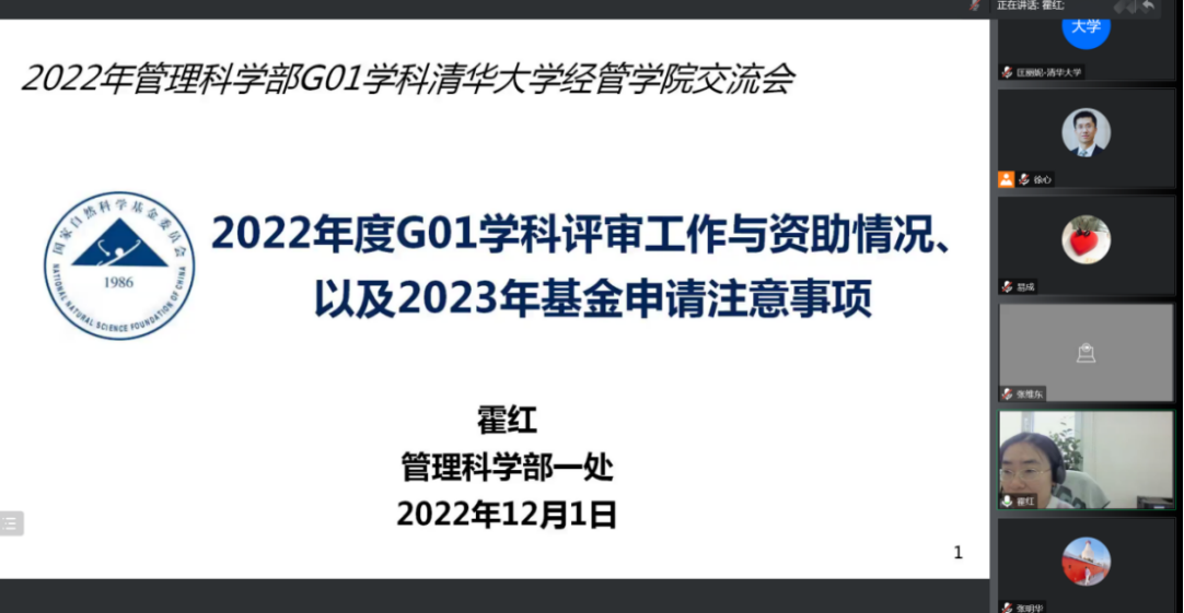 在第二场报告中,国家自然科学基金委管理科学部一处霍红处长就2022年度G01学科评审工作与资助情况、以及2023年度基金申请注意事项作了报告。在报告中,霍处长首先介绍了基金的基本情况,包括基金委的管理构架、基金委项目类型、管理科学部项目管理形式等。霍处长指出,管理科学部一处“G01管理科学与工程”是探讨管理科学基础理论、方法与技术的学科,并对一处的主要资助方向进行了介绍。霍处长将基金委的项目从“自由探索类”、“顶层布局类”和“人才类”三个角度进行了类型划分,对各类项目的资助额度和项目数量进行了逐一介绍。霍处长还对各类项目的管理形式和评审形式进行了说明。
