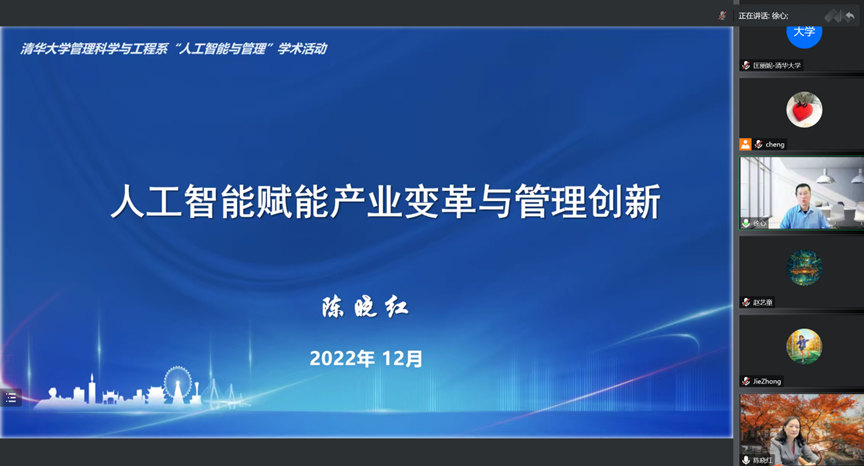 2022年12月1日,世俱杯官方网站管理科学与工程系举办了“人工智能与管理”系列学术研讨第二次活动。本次研讨会采用线上的方式,邀请了中国工程院院士、湖南工商大学、中南大学教授陈晓红院士和国家自然科学基金委管理科学部一处霍红处长作报告。研讨会由清华经管学院副院长徐心教授主持。