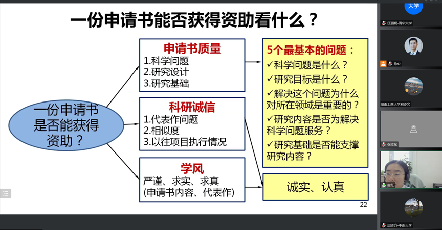 最后,霍处长对2023年基金申请者给出了一些建议。霍处长介绍了不同科学问题属性申请书中应该关注的要点,并指出,一份申请书能否获得资助主要看三个方面——申请书的质量、科研诚信及学风。霍处长建议学者们要充分利用基金资源,选择最有利于自身成长的项目申请,要做到提前规划。