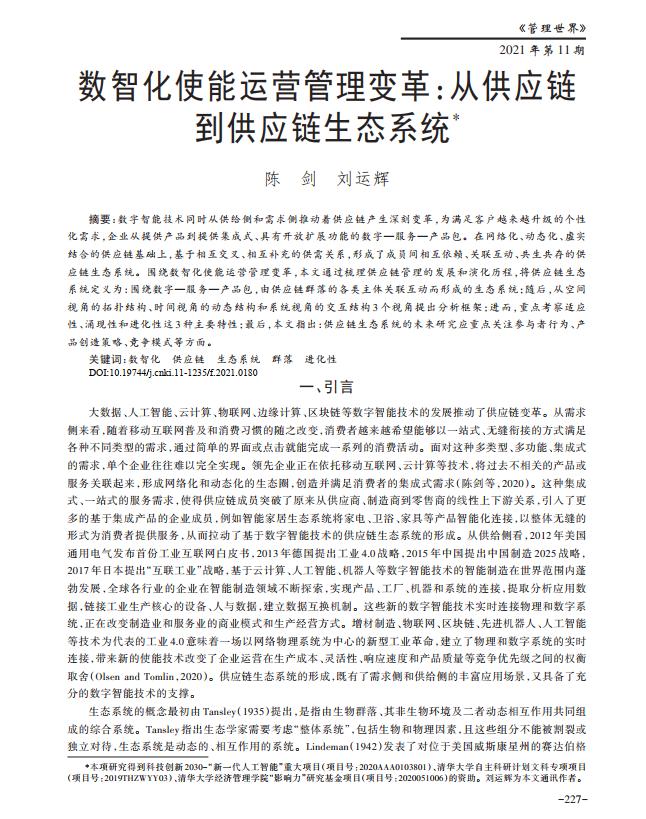 陈剑、刘运辉合作成果《数智化使能运营管理变革:从供应链到供应链生态系统》(论文)