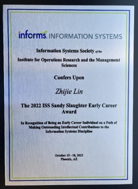 INFORMS ISS is an authoritative academic organization in information systems. The Sandy Slaughter Early Career Award aims to recognize young scholars for outstanding contributions and influence in information systems. LIN is the first receiver in an institution from Chinese mainland since the establishment of the award.